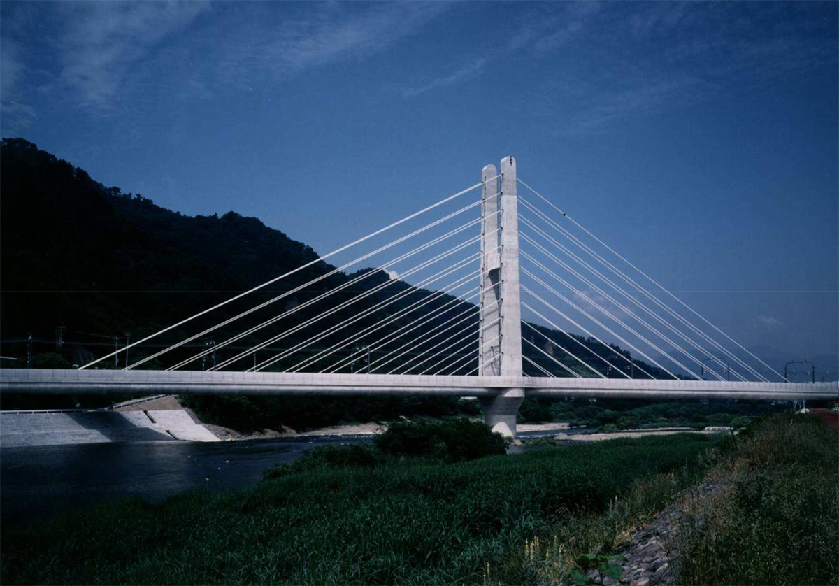 写真-2 PC斜張橋の第2千曲川橋梁(斜材の色は黒から白に)