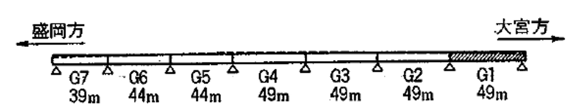 東北新幹線の沼辺橋梁は複線道床式下路プレートガーダー(4×49+2×44+1×39m)です(写真-3/図-1)。
