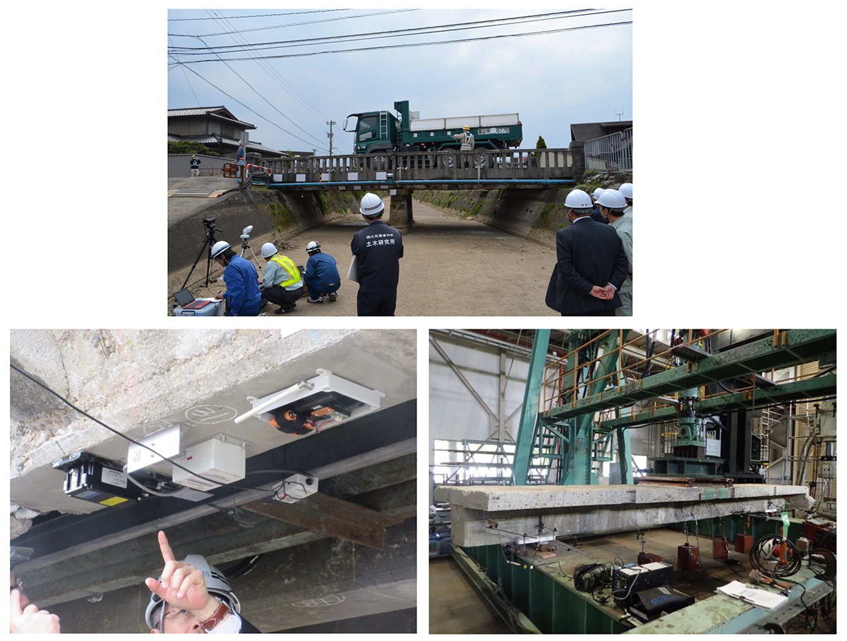 (上写真)現地実証試験状況(右写真)センサー設置状況(左写真)解体後、土木研究所での破壊試験