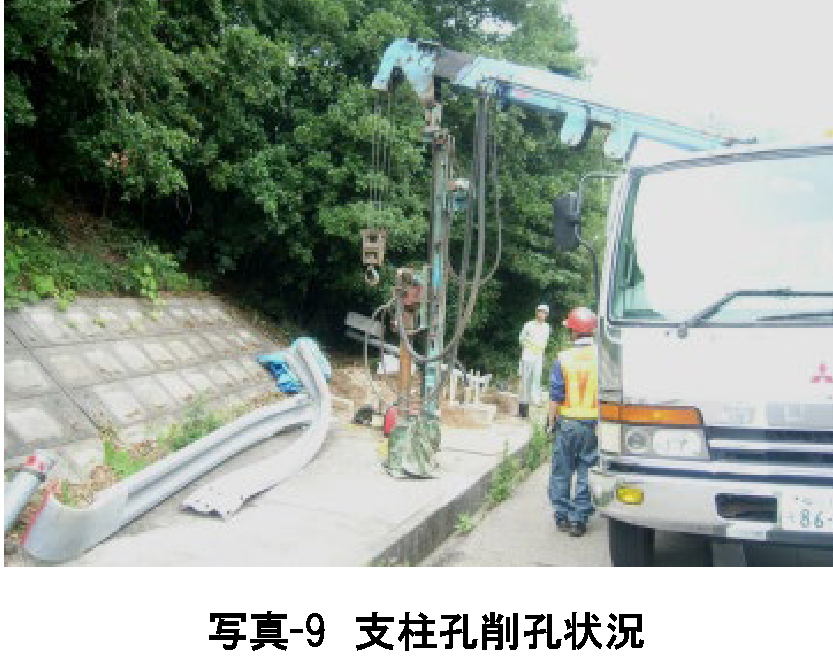 事故後の対策としては、①ガードレール支柱の所定の埋め込み深さを確保すること、②シールコンクリートを撤去し、変形性能が発揮できる構造とすること、③②はこの現場に限らず、全本四道路ですること、と提案した。①に対しては、事故後の現地調査の後、削孔してガードレール支柱を設置(写真-9,10参照)済みであった。