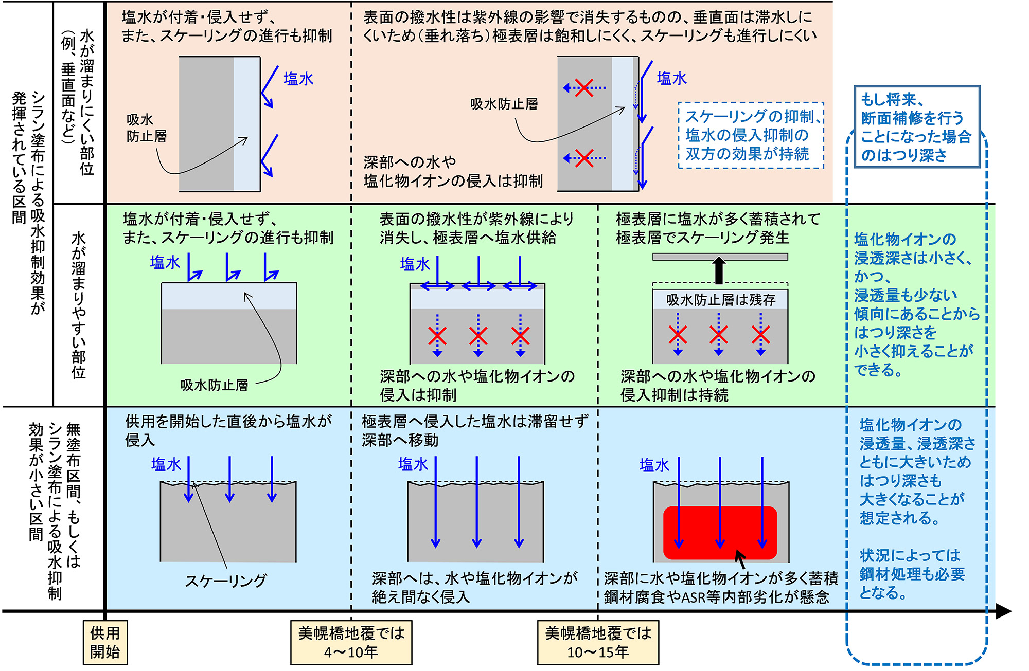 無塗布区間もしくはシランの効果が小さい区間は、供用開始後、4年目には既に車線側側面にスケーリングが顕在化しました。その後、10、15年目にかけて、スケーリングの進行は緩やかではありましたが、コンクリート深部へ塩化物イオンが多く侵入しており、将来、鋼材腐食やASRなど内部劣化の発生が懸念されます。