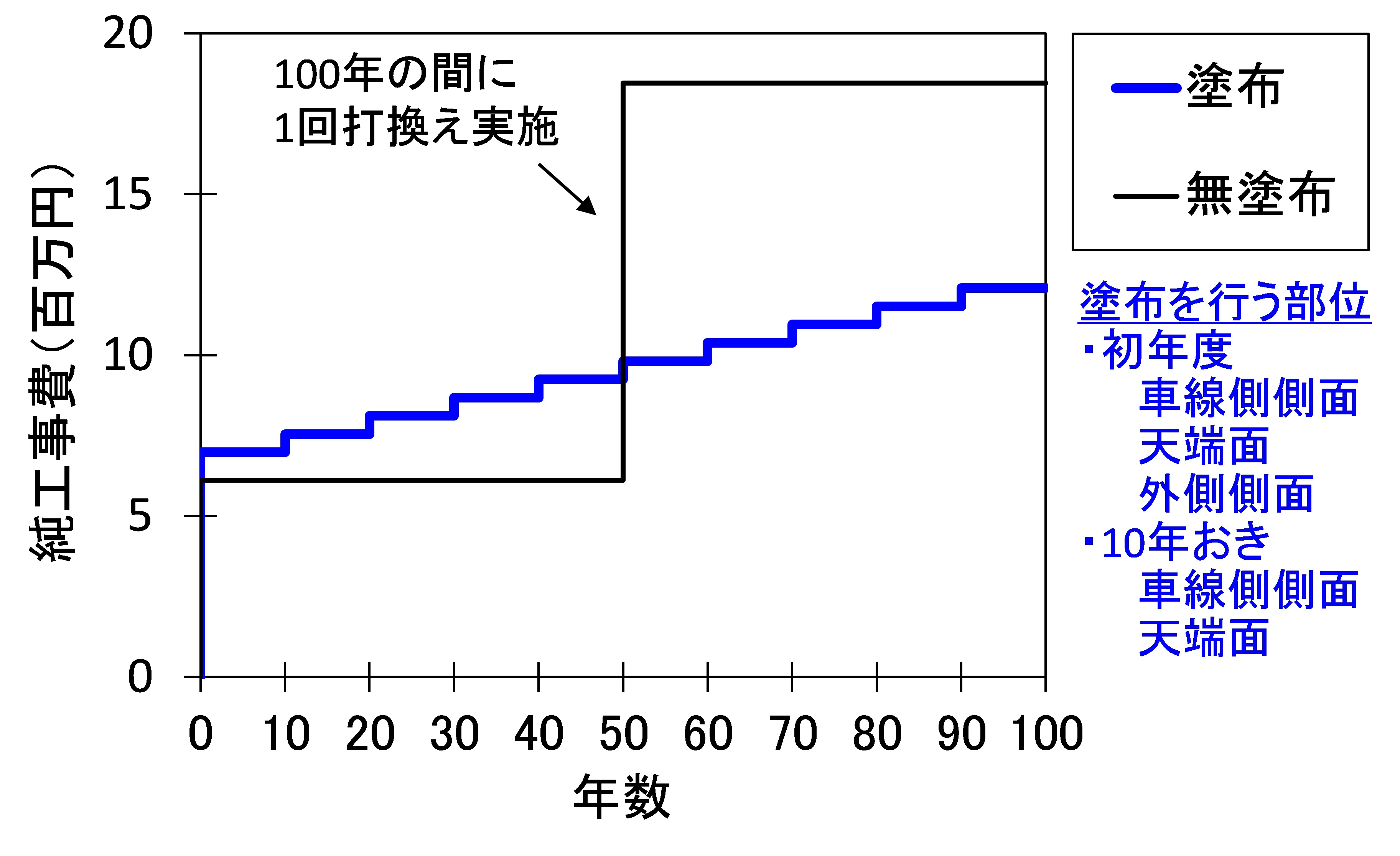 図-7は美幌橋の地覆コンクリートをモデルに、初年度は地覆全面に塗布し、以降、10年おきに車線側側面と天端面に再塗布を行った場合の純工事費(管理費、経費を含まない)を試算したものです。外側側面は、写真-5の結果をふまえ、再塗布の対象から除外しました。シランの材工費は、北海道開発局のホームページに公開されている資材価格調査による単価を適用しました。この図に示すように、無塗布の部材を100年に1回打換える場合に比べると、部材のライフサイクルコストの減少、部材の維持費の平準化が図れる試算結果となりました。