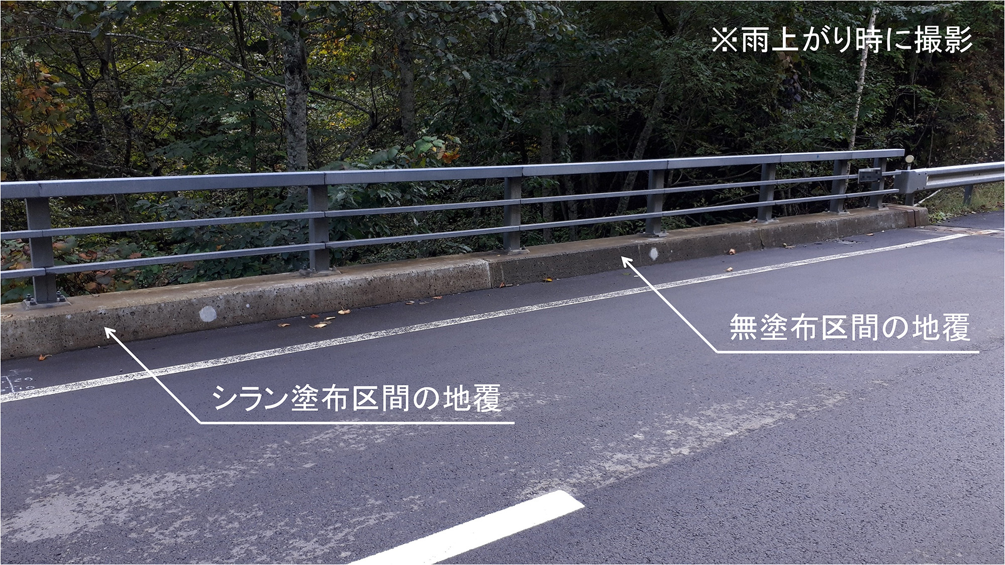 なお、将来、補修工法として断面補修が選択されるとしても、前述したように、シランを塗布した場合ははつり深さを小さく抑えることができることから、補修費の縮減に繋がることも期待されます。 現在、追跡調査は、美幌橋以外の道路橋でも行っています。写真-7は、塗布から16年を経た別の道路橋の一例です。この橋は直線橋で、路面水が地覆周りに集中的に滞留しにくい構造になっています。シラン塗布区間は、表面に小さなあばたはみられますが、外観はほぼ健全で、顕著なスケーリングは見受けられません。この写真は雨上がり時に撮影したもので、塗布区間をみますと、吸水が抑制されていることもあり、乾きも早いことも見てとれます。