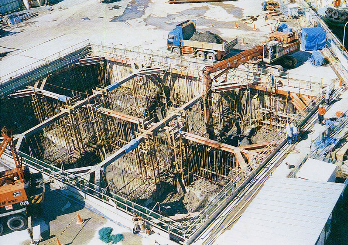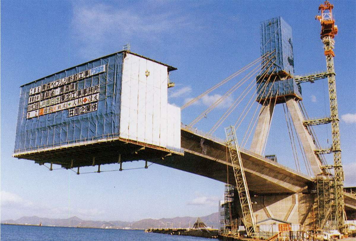 主塔のコンクリートは圧縮強度60N/mm2です。当時使われ始めていた高性能AE減水剤を用いました。地上からの高さ約100mまで、ポンプ圧送しました。