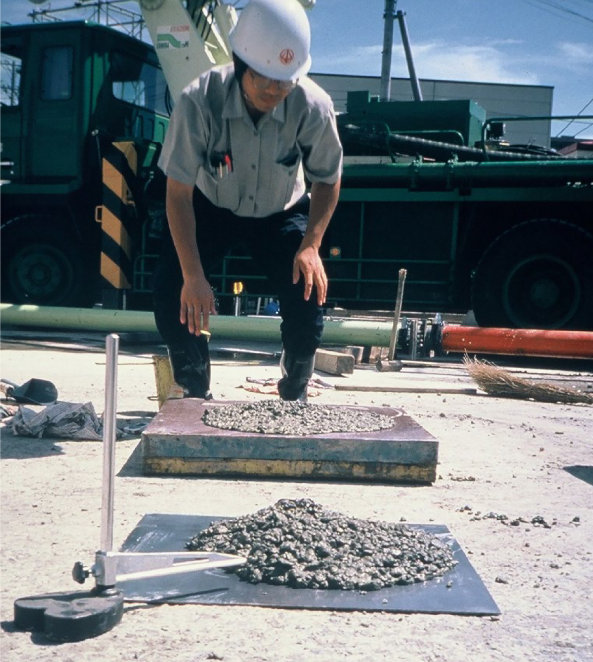 写真-6はコンクリートのスランプコーンを抜いた時の状況です。
