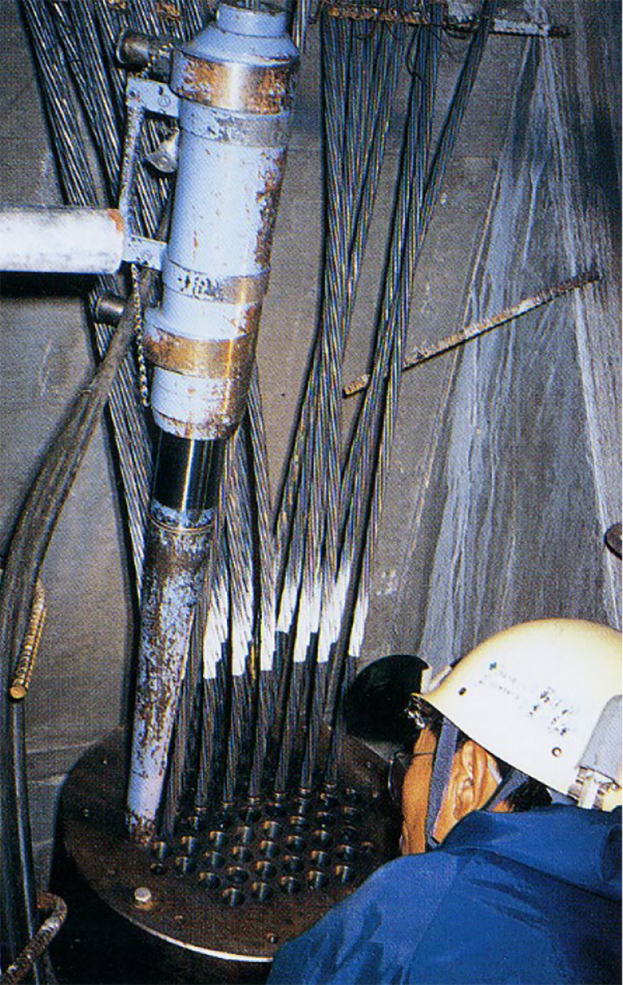 次の写真-8は斜材ケーブルの一時緊張の様子です。ストランド1本ずつ定着具に止めていきます。工場で、ストランド1本ごとに同じ長さでマーキングして、そのマーキング位置を揃えて、長さを設計値になるように止めてもらいました。この方法で、ストランド1本ごとの張力のばらつきをなくすことができます。