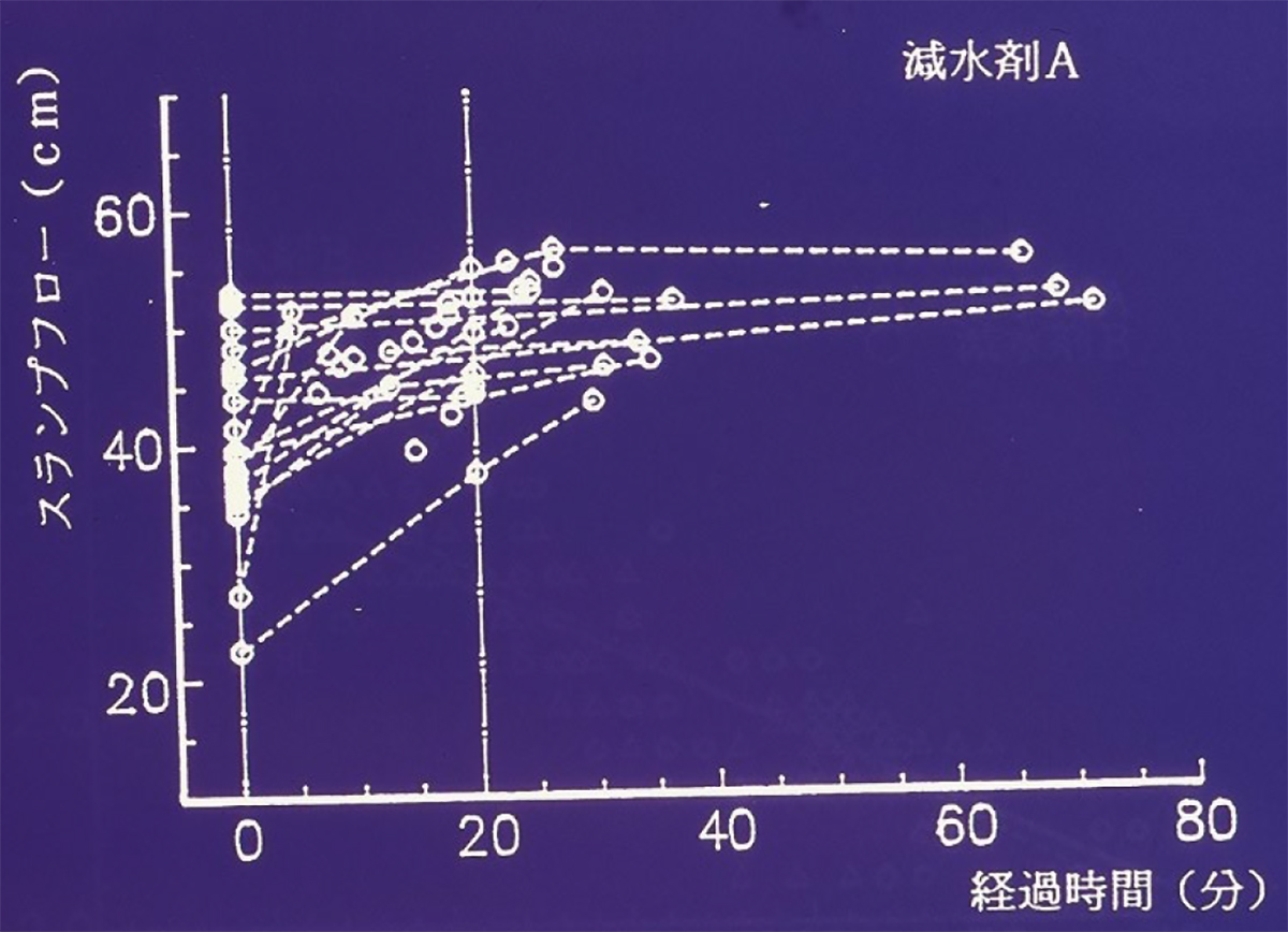 図-6はコンクリートのスランプフローの時間経過にともなう変化を示しています。山陽新幹線で岩鼻のPCトラスを施工した頃はスランプがすぐに低下したのですが、それと比べて、スランプの低下が少なくなり、高性能AE減水剤の性能が格段に向上していることをこの時実感しました。
