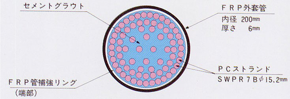 図-7は斜材の桁側の定着構造です。図-8は斜材の塔側の定着構造です。図-9は斜材の断面です。FRPの外筒菅にPCストランドを最大91本配置しています。