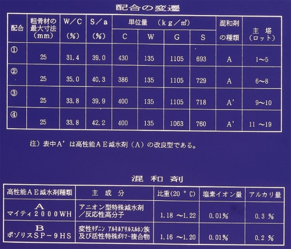 コンクリートの配合を表-1に示します。季節に応じて配合を変えています。高性能AE減水剤は表-1に示す2種類のものを用いました。