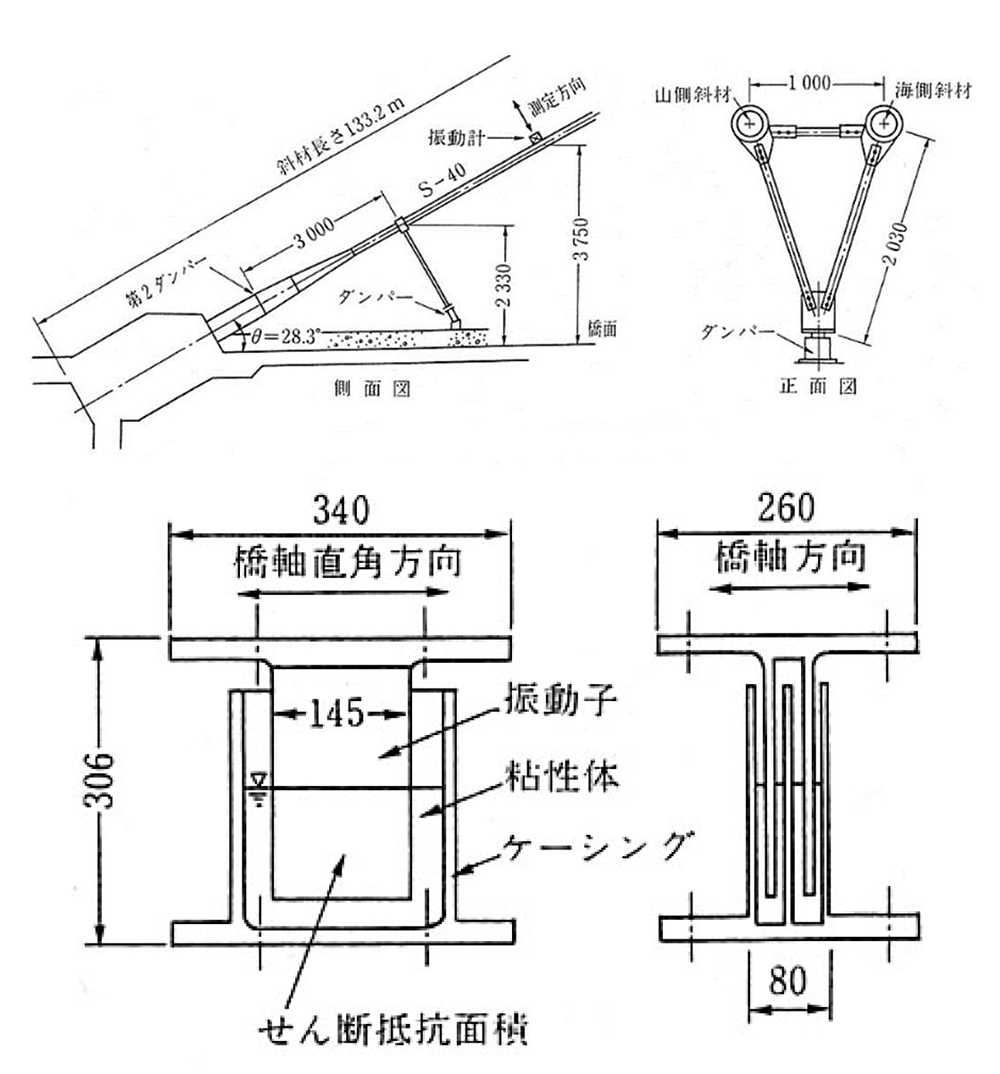 その後、斜材の下端にダンパーを付けて対処しています(図-6、写真-5)。この斜材に手を当てると、普段でも小さな振動が常時しています。この常時の微振動を感じると、斜材の設計は慎重に扱わないといけないという思いを強くします。斜材の構造はPCストランドをFRPの外筒菅にいれて、PCグラウトを注入した構造です。FRP管には金色の塗装がしてあります。