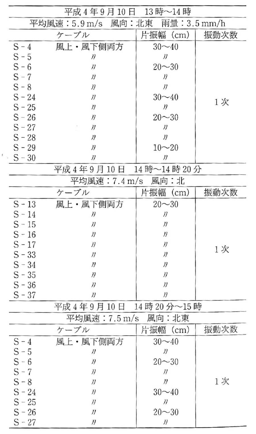 青森ベイブリッジの斜材はグラウトの施工前までは振動はなかったのですが、グラウト施工が終えた状況で振動が起きました。台風の過ぎた後の小雨の天候の時、弱い風速でレインバイブレーションが起こりました。その日の斜材の振動の測定結果を表-1に示します。