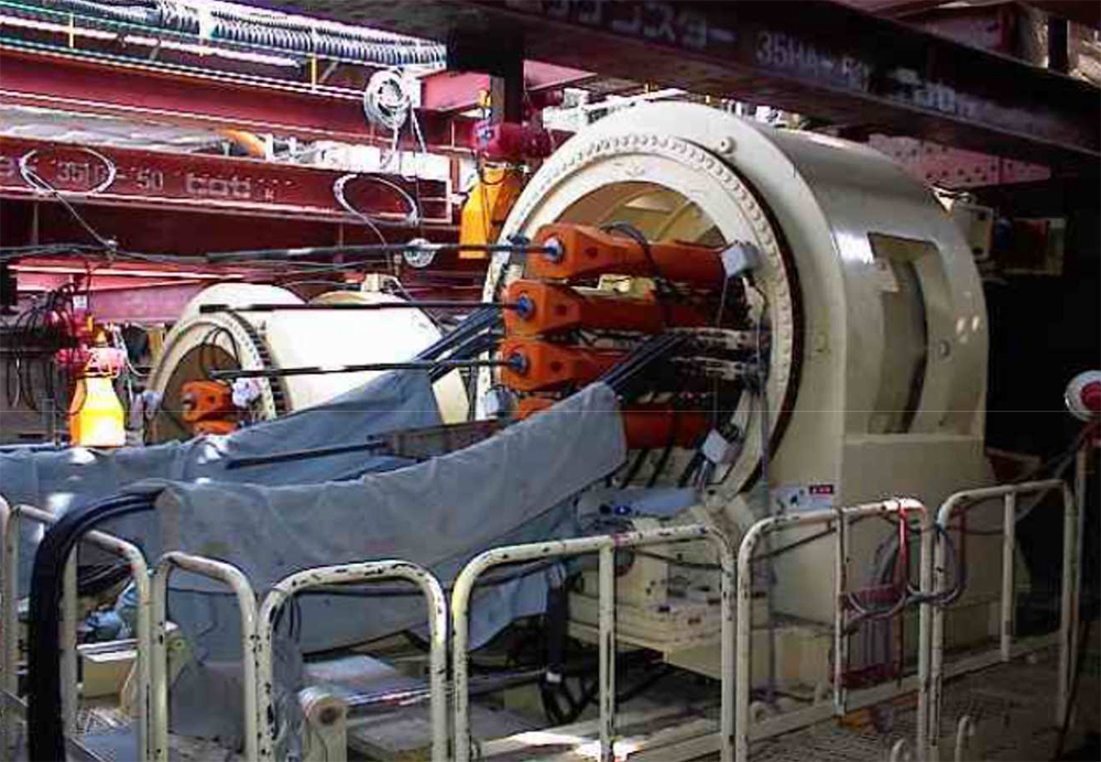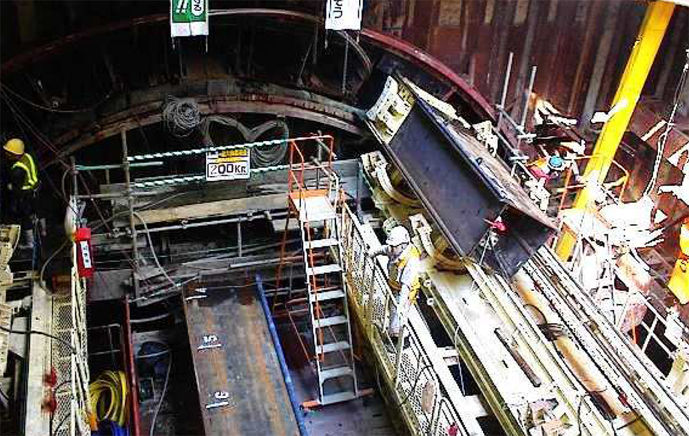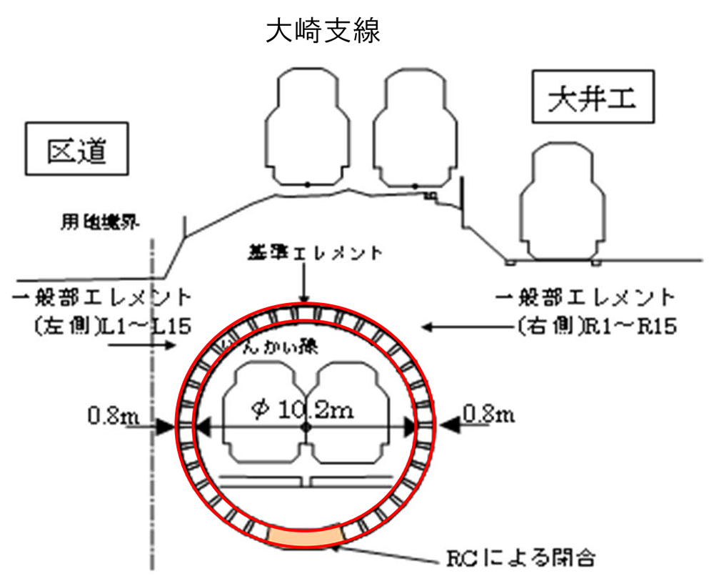 この区間は,りんかい線が大井町駅から大崎駅に至る浅い位置のトンネルで、湘南新宿ラインの線路を、線間を広げ、地下から地上に顔を出す部分に当たります。湘南新宿ラインの線路直下の部分では線路下を32.7/1000という急こう配で縦断します。そのため土被りの大きい部分から土被りの小さい状態までの施工となります。ここでエレメントを挿入して接合して構造物を造る本工法を採用しました。完成形は円形複線断面のトンネルとなります。