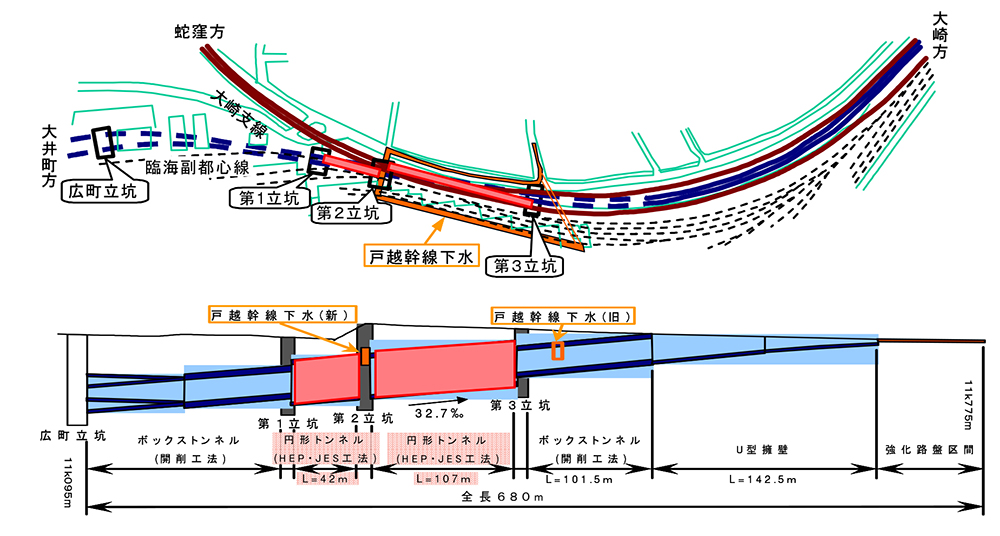 図-3は、大崎支線(新宿湘南ラインの線路)の下にトンネルが造られる断面を示しています。