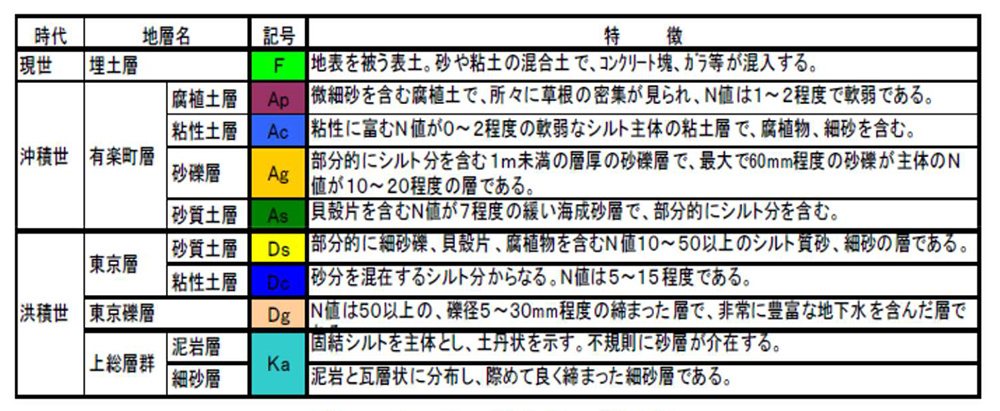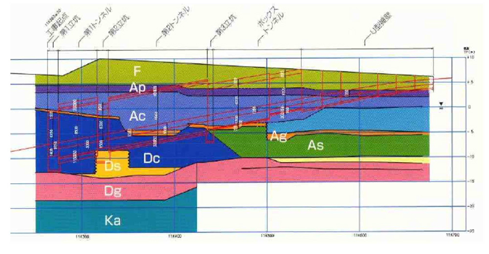 この区間の地質は、大井町駅付近の目黒台台地から、目黒川低地帯に順次下がっていく地域に当たり、上総層群とこれを被っているローム層、武蔵野礫層、東京層、東京礫層、その上に沖積世の有楽町層、及び埋め土が分布しています。この施工区間は東京層の粘土土層(Dc層)、有楽町層(Ag、Ac、Ap層)及び埋め土層(F層)に位置しています(図-5、表-1)。この工法は第1竪坑から第3竪坑の範囲に採用されています。