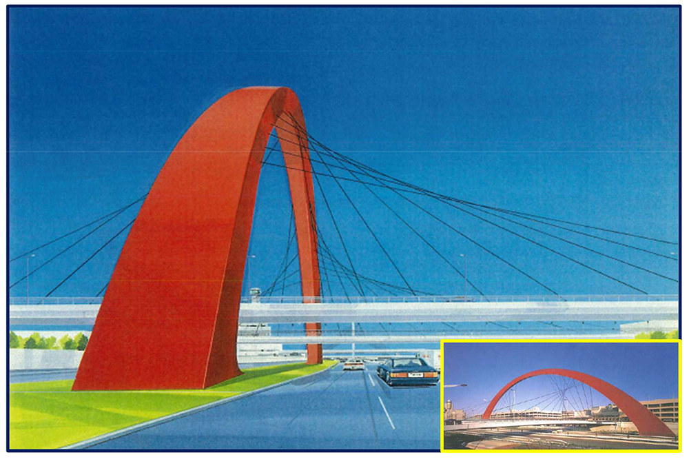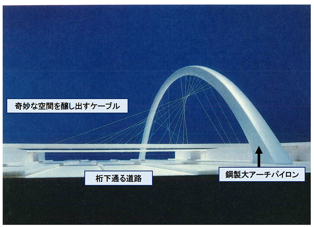 構築物は高さ制限を受ける空港エリアにおいて、大アーチと3次元的に組み合わされるケーブルの創り出す空間は、目新しく、見る者に感動を与えてくれる。景観上重要な位置を占めるアーチ・パイロンについては、「アーチの形状は、その断面形状に関して『菱形』、『台形』、『逆台形』、『アーチ上部にスリットをいれたもの』」など様々な案が検討され、アーチの稜線を強調する形として検討案4つの中から美しいアーチの稜線を強調できる「逆台形」案が選定された。