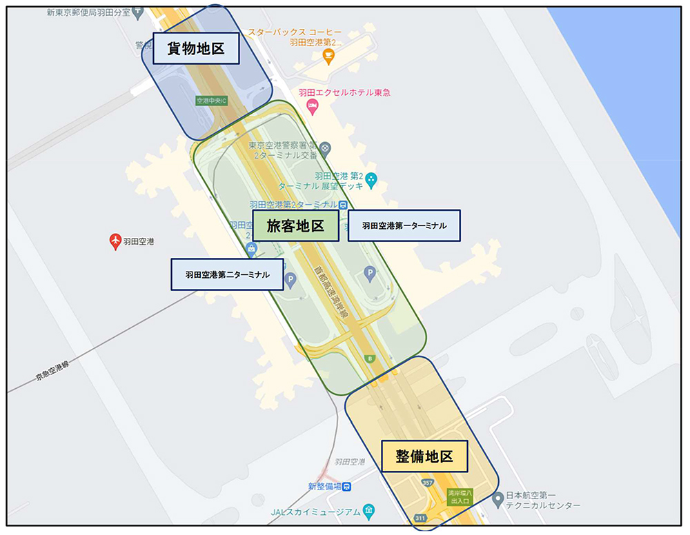 東京国際空港ターミナル地区(約3200m×600m)の広大な敷地は、図-6に示すように各旅客ターミナルビルを中心とする『旅客地区』、『貨物地区』、『整備地区』の3地区で構成されている。