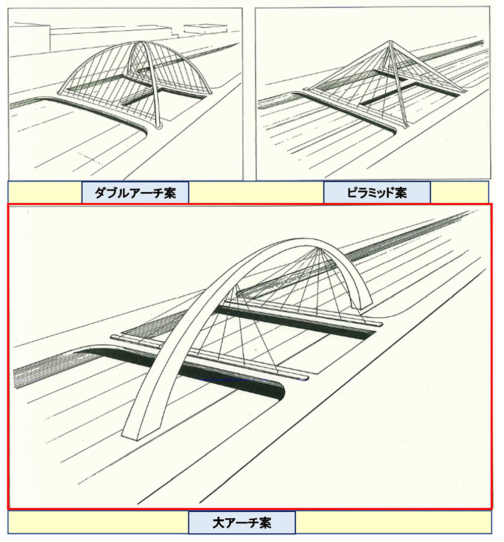 確かに、図に示す「ダブルアーチ案」や「ピラミッド案」を見て明らかなように、両案の籠のようにケーブルが輻輳した外観を採用するよりも、一つの大アーチで吊る、シンプルですっきりした外観を選んだ方が好ましいと私も感じる。