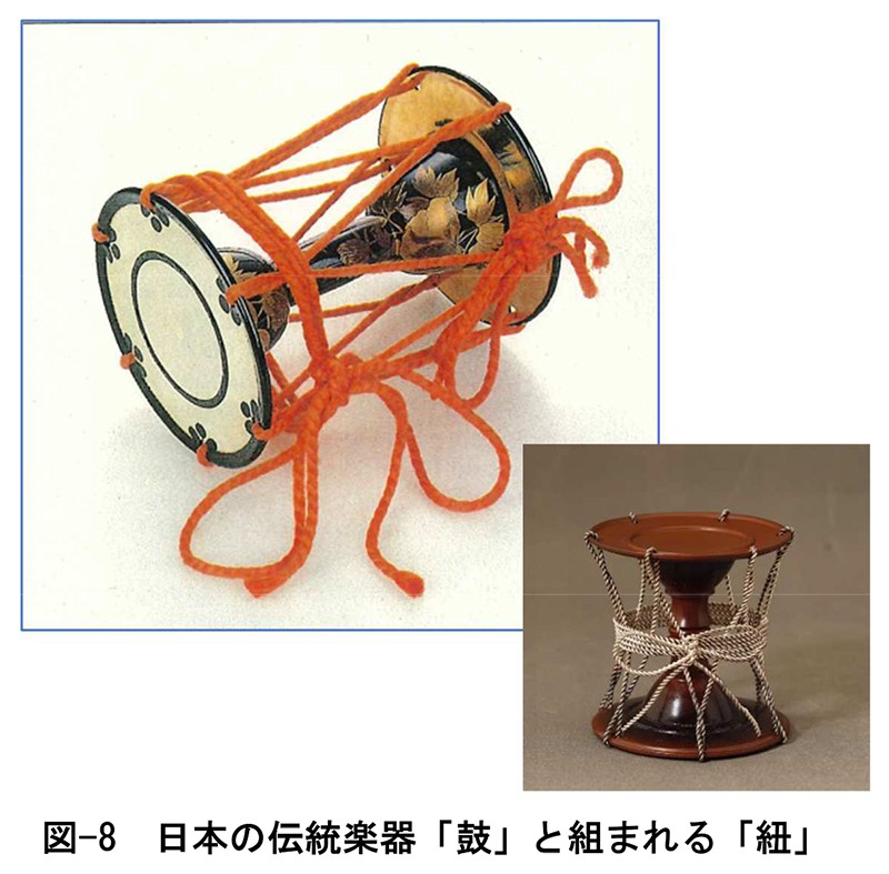 斜張橋の創り出す空間の重要なポイント、大アーチ・パイロンに組まれるケーブルについては、「パイロンとケーブルによって創り出す空間を従来の斜張橋、吊橋には見られない立体的に変化の富んだケーブル景観を与える非常に特徴的なものとして、『鼓の紐のイメージ』」と表現している。ここで、古くから伝わる伝統的な遊び「綾取り」の「紐」のようなケーブル、資料で使われている「鼓の紐」の理解を深めるために、実際に能楽等で使われている「鼓」と、先の景観研究会資料で引用した「鼓」画像とを重ね合わせ、図-8に示した。
