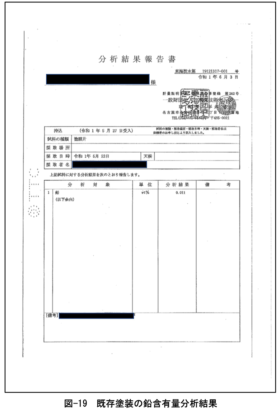 既存塗膜の塗料は、ジンクリッチプライマー、ミストコート、エポキシ樹脂塗料、ふっ素樹脂塗料であることから、鉛分は含有していないはずである。既存塗膜(塗料)分析結果を図-19に示す。