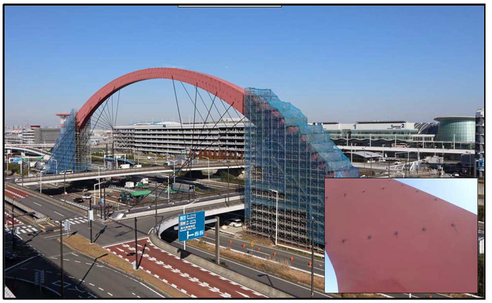 写真-2は、吊ピースがパイロン全面に設置された、その一部を見上げて拡大した状況である。あのすっきりした外観に、『髪の簪』のような突起が一面に出来たのを見た人の多く、特に景観に興味があり、ランドマークを意識している人に大きな動揺が走った。多分、それらに無関心、景観に興味を持って建造物を見ていない人には、分からないであろう。また、世界的に広がり、今も人類を悩まし続けているCOVID-19によって、東京国際空港に人が集まらなかったことも幸いとなっている。