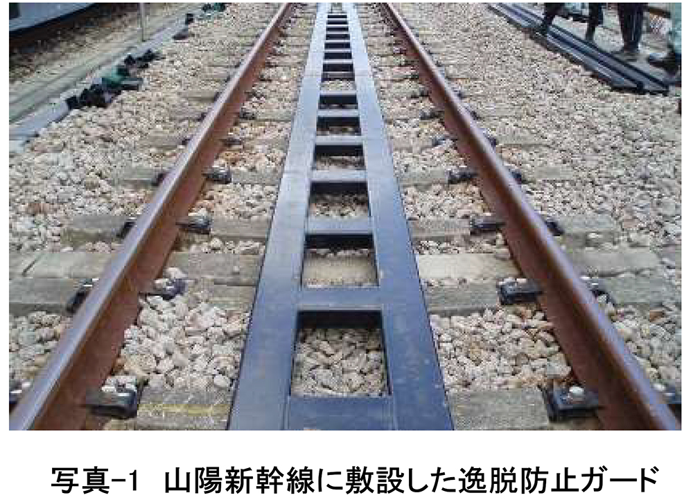 JR西日本は、逸脱防止ガードを軌道内に敷設し、万が一、脱線した場合でも、車輪が同ガードに当たることで車両の移動量を小さくし被害を最小限にとどめるようにして、2015(平成27)年度末までに山陽新幹線新大阪~姫路駅間の敷設を終え、引き続き、姫路~博多駅間において計画的に敷設を進めている。写真-1に山陽新幹線の逸脱防止ガードの一例を示す。