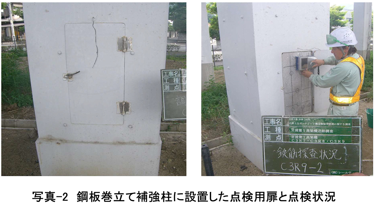 このような背景により鋼板内部の既設柱の状況を確認できるように、耐震補強時に写真-2に示すような開閉が可能な点検用扉を設置し、既設柱内部に埋め込んだ電極を用いて経年による鉄筋の腐食状態を長期的にモニタリングする試みを行っている。ただし、このような点検は、全ての高架橋で実施することは困難であることから、今後、鋼板内部の既設柱の鉄筋の腐食状態を効率的に確認する技術開発を行う必要があると考えている。