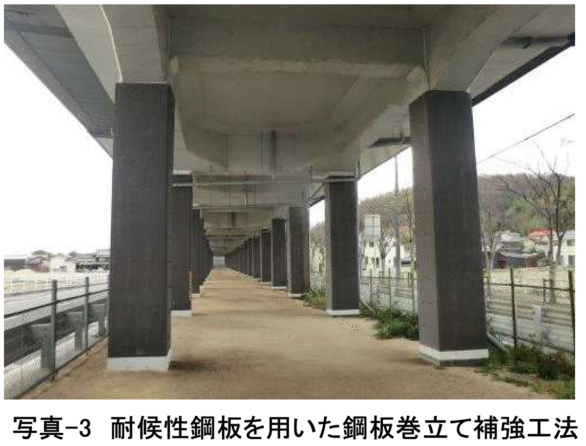 このため、JR西日本では、耐候性鋼板を用いた巻立て補強工法を岡山以西の山陽新幹線高架橋で導入し、維持管理費用の削減を図っている。耐候性鋼は、適量の銅やニッケルやクロムなどの合金元素を含有し、表面に緻密な錆を形成する鋼材で、緻密な錆層が鋼材表面を保護し、錆の進展を抑制する。耐候性鋼板を用いた場合の初期費用増は、普通鋼板の1回の塗替え費用で相殺されることから、コスト削減効果は大きい。写真-3に耐候性鋼板を用いた鋼板巻立て補強工法の一例を示す。