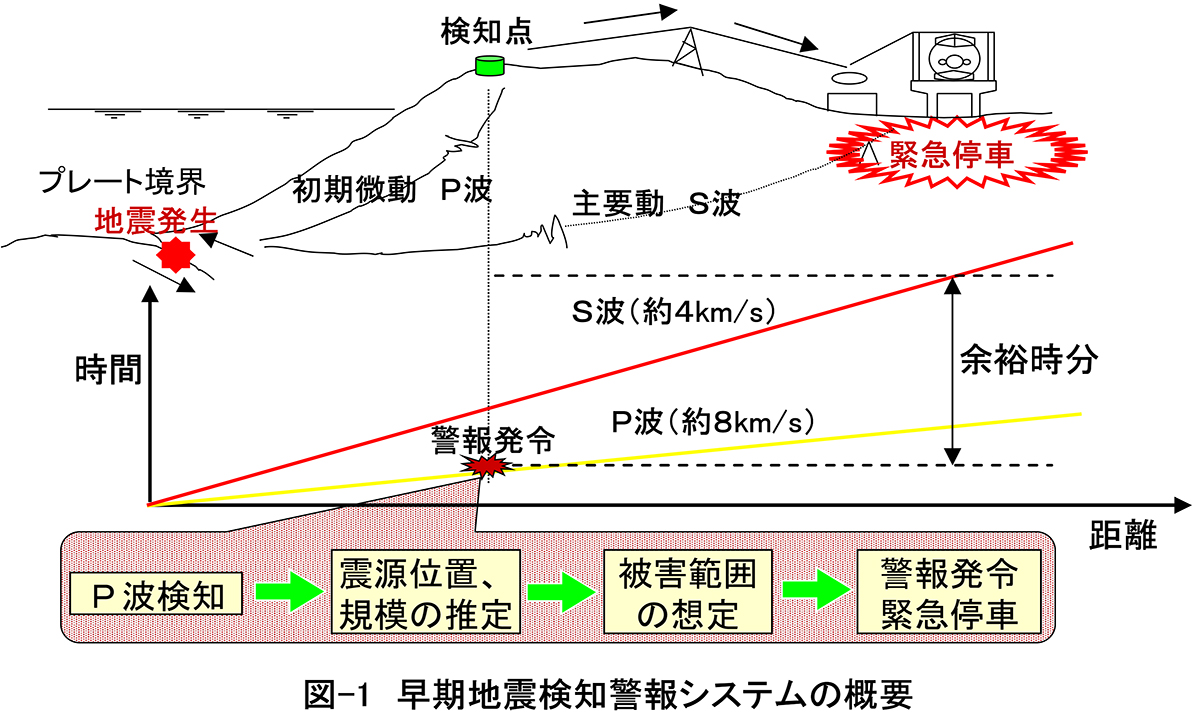 国鉄鉄道技術研究所および国鉄民営分割化後の(財)鉄道総合技術研究所(以下、JR総研)が開発した早期地震検知警報システムは、地盤の中を伝わるP波(縦波)とS波(横波)との速度の差を利用して、海溝型地震に対しては海岸付近の検知点に設置した地震計でP波を検知し、P波の振幅増加率などの解析結果に基づいて地震の位置や規模をいち早く推定し、大きな被害が想定される地域にはS波が到達する前に警報を出し、走行中の列車を停止または減速させるシステムである。