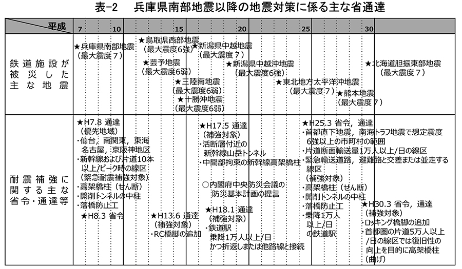 表-2に示すように、重要な線区とは、当初は、新幹線およびピーク時片道1時間当たり10本の列車が運行されている在来線の線区であったが、後に、在来線においては結節駅となる駅舎建物などが耐震補強の対象となり、さらに輸送密度1万人以上/km・日の線区に拡大された。鉄道事業者は、省通達に基づき自らが定めた実施計画により計画的に耐震補強を推進してきている。
