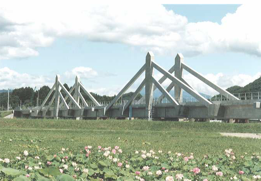 この橋梁は河川改修にともない造り変えられたものです。下路トラスや、斜張橋、斜版橋などの案がありました。堤防の付近に住宅もあり、騒音を考慮して、経済性と合わせてこのコンクリートの斜版橋を選定しています。PC斜張橋も比較しましたが、斜材のコストが高く、コスト面で斜張橋より優れているこの構造としています。