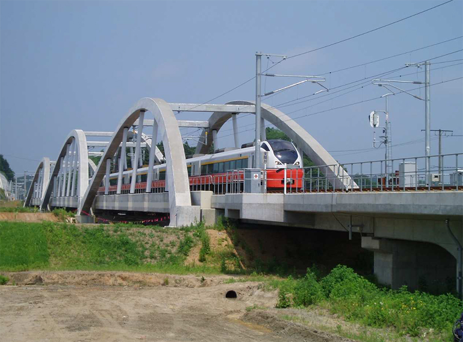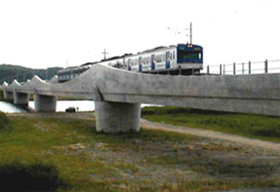 仙石線鳴瀬川橋梁(75.8m+4×85m+71.3m/写真-4)は高欄部分を構造部材にデザイン面も考慮して取り入れた橋梁です。箱型断面の桁と、防音壁を一体にした構造となっています。
