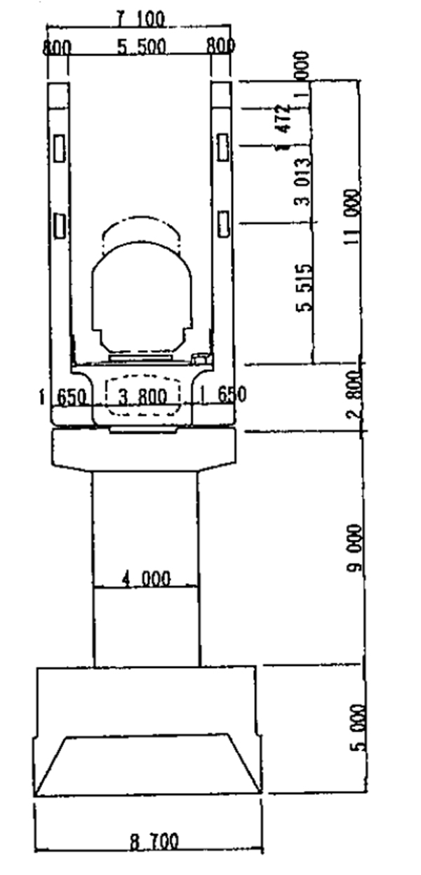 内房線の姉ヶ崎橋梁(79.5m/写真-6/図-4))は、U型断面主桁に支点上から直線的に配置した圧縮部材を取付けて,その頂部から2本の吊材で主桁を支持する構造形式の橋梁です。いずれもコンクリートの斜材となっています。