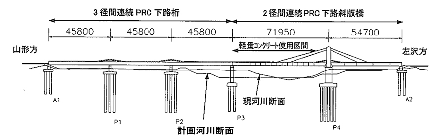 2径間連続桁で斜材をPC部材としている橋梁です。桁長が左右でアンバランスなために、長いスパンには軽量コンクリートを用いています。