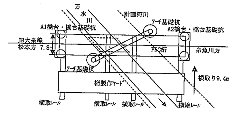 本橋梁は大糸線豊科-柏矢町間の万水川を斜め急角度で横断するスパン48.5mの橋梁です(写真-7/図-5)。中間のアーチにて主桁を吊った構造となっています。