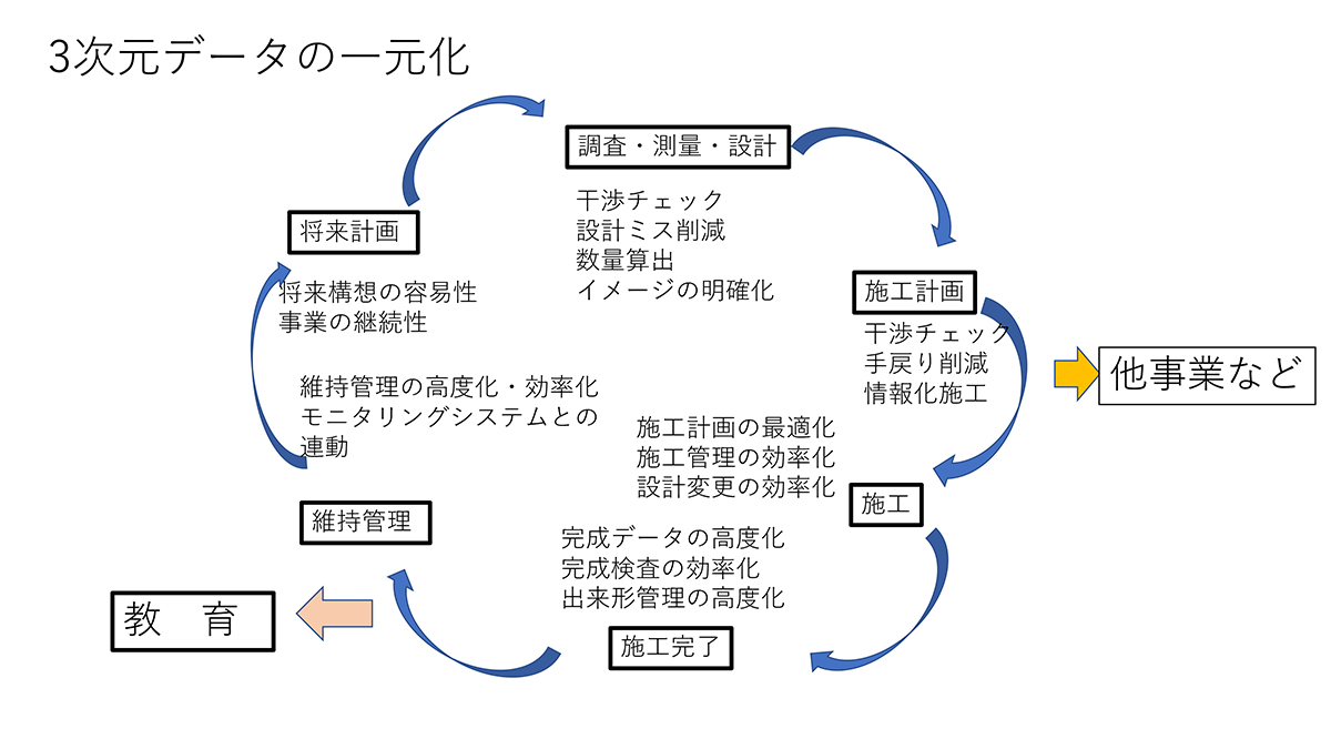 この、BIM/CIMも建設事業においては、今後必至の技術である。様々な場面で活用できるのはもちろんであるが、そもそも、全ての物は3次元でできているが、なぜわざわざ2次元(平面)に置き換えた、モノを見ているのだろう。最近では図面が読めない者も増えている。私が現役のころから、図面の起こし方がわからないというプロたちが居た。なぜか?図面をCADのオペレーターに描かしていたからである。BIM/CIMの画像は、今後、教育や維持管理の場面で本領を発揮するだろうが、その、データ構築から運用において正しい判断が重要である。これについて行けるかである。