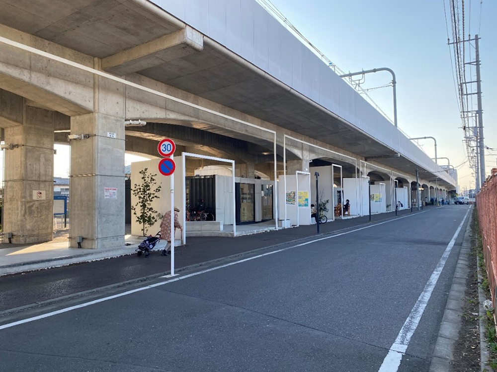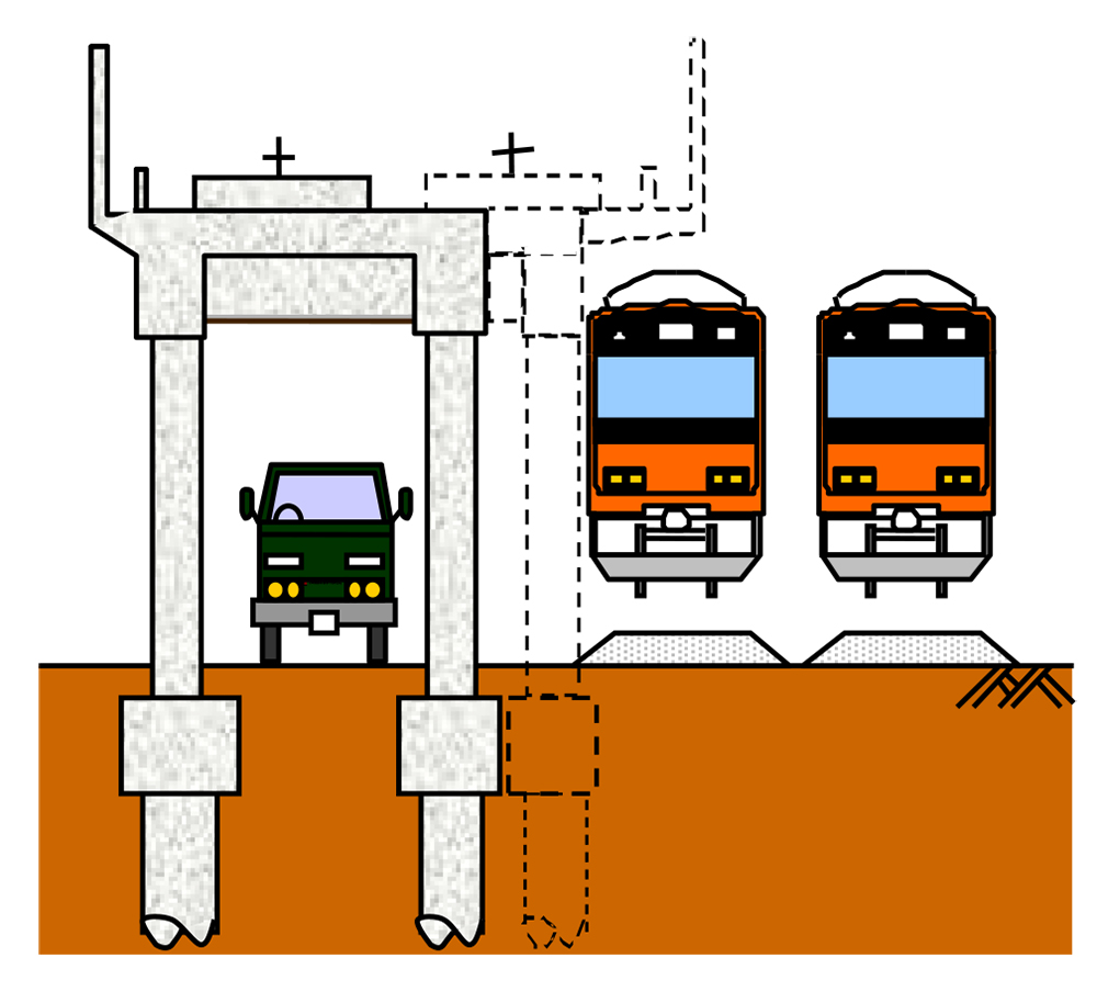 都市部の連続立交工事など、狭隘な場所での工事では、線路と民地に挟まれて用地が制約されている場所での工事が多くなります。資機材を搬出入のための工事用通路を施工現場で維持するためには、柱と柱の間を常時開けておくことが必要です。そのためには地中梁をなくして、柱間での掘削をなくし、スラブは埋設型枠か、プレキャストにして支保工不要とすることが必要です。この高架橋は、地中梁をなくし、埋設型枠を用い、柱間は常に工事用に使えるようにして造られました(図-12)。