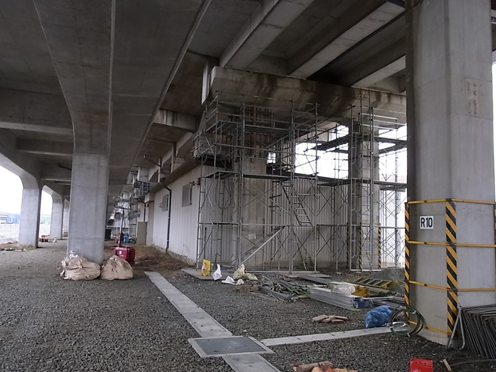 写真-4は東日本大震災後の長町高架橋です。柱のスパンは隣接する新幹線に合わせて、新幹線柱の1本おきとしたので、スパンは約17mです。隣接する新幹線高架橋には耐震補強前の柱に被害が生じましたが、パイルベント方式のこの高架橋は設計基準が新しいこともあり被害を受けませんでした。