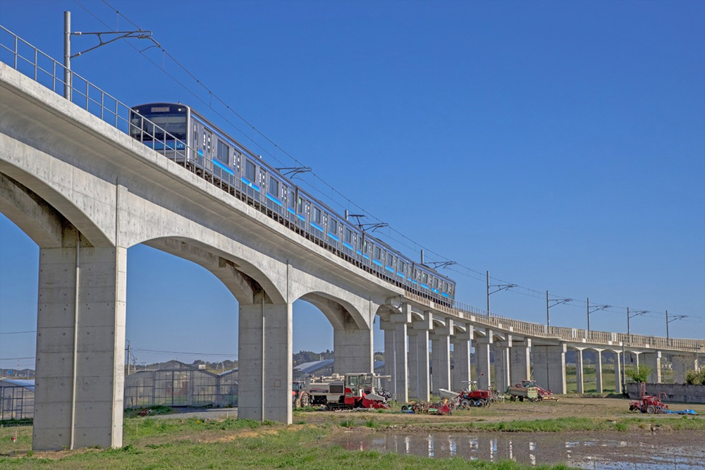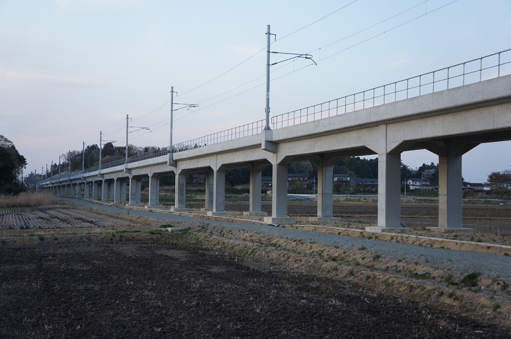 遠景から見られる高架橋は、スパンが小さいと柱が煩雑に見えてしまいます。それを避けるためには、ある程度のスパンを取ることが必要です。写真-5は、仙石線の津波で被害を受けた線路を移設した新設高架橋です。スパン29mのラーメン高架橋で、ひび割れ防止に梁には若干のプレストレスを入れた構造となっています。