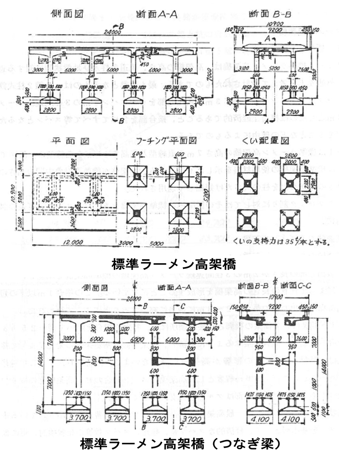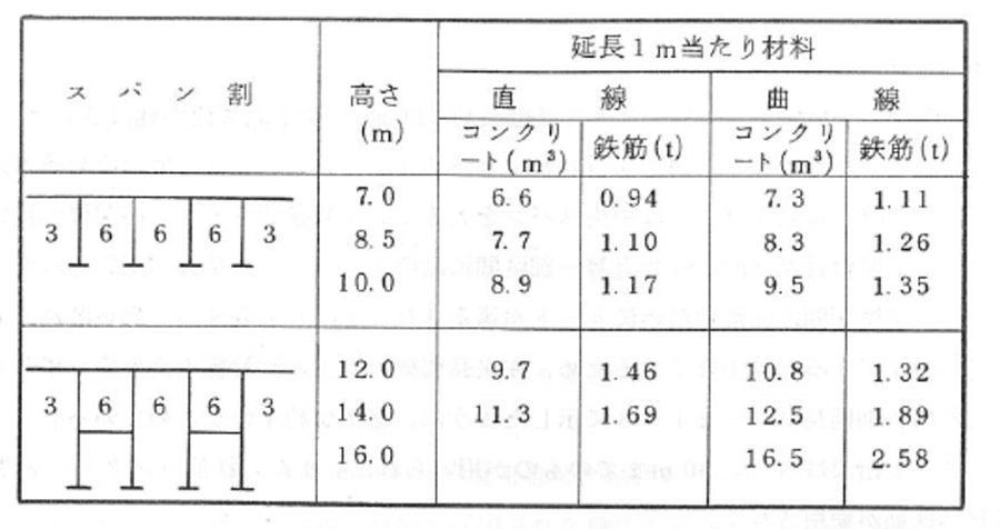 図-11は東海道新幹線高架橋の標準設計の一般図です。高さ10mまでは1層の高架橋で、10mを超えると柱の中間につなぎ梁を設けています。表1は材料の数量を示しています。