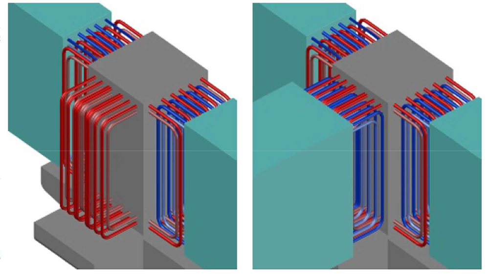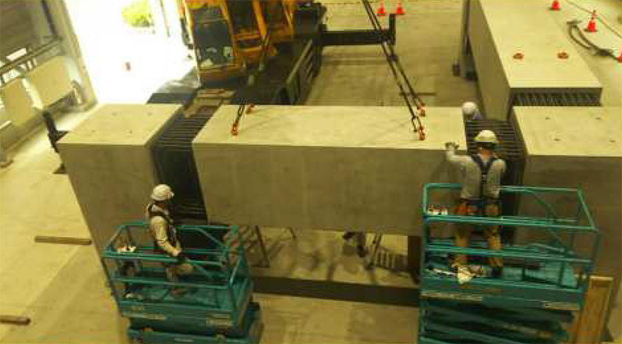 柱と梁の接合は閉合継手を想定しています(図-15)。梁の仮受けに、ハンチを設けておくか、仮設のブラケットを設けてその上に縦梁や横梁を据え付けます。その部分に鉄筋を追加し、高流動コンクリートを施工します。