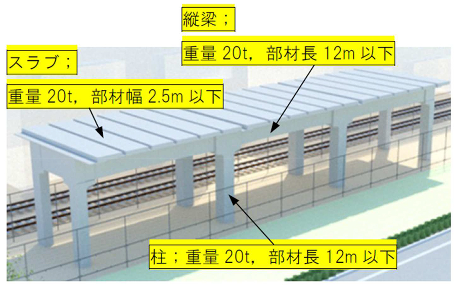 鉄道高架橋は、柱と梁とスラブの組み合わせが中心で、同じような形状の、少ない部材の組み合わせで成り立っています。柱や梁の寸法をできるだけ統一することで、プレキャストのメリットが出しやすい構造形式といえます。部材を運搬して現場に持ち込むということを想定して検討した結果を以下に紹介します。