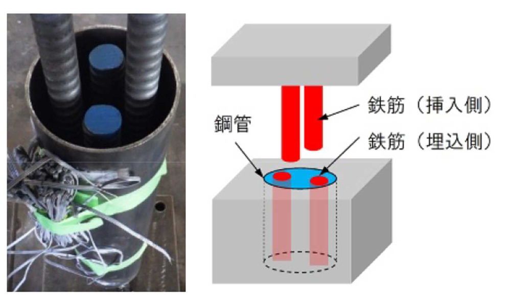 柱と基礎の鉄筋継ぎ手は鋼管内の重ね継ぎ手としています。柱から飛び出した鉄筋をモルタル充填した基礎の鋼管に差し込みます(図-14)。