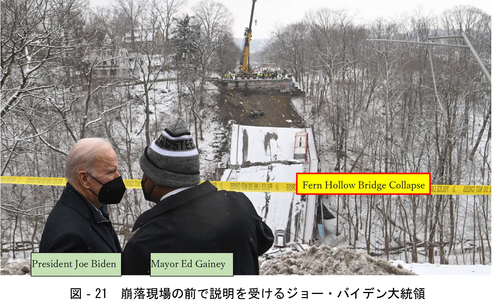皮肉なことに、ジョー・バイデン大統領は崩落事故発生当日に、米国の社会基盤施設の高齢化に対する戦略的なマネジメント施策について、崩落事故現場から僅か2マイルの『カーネギーメロン大学』で大統領肝いりのインフラ投資政策について講演する予定であった。図‐21は、崩落したファーンホロー橋の右岸取り付け部でエド・ゲイニー市長から説明を受けるジョー・バイデン大統領の状況である。ジョー・バイデン大統領の予定していた講演の内容は分からないが、米国で進めているインフラ投資政策は以下である。