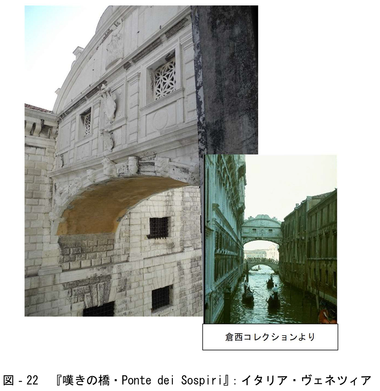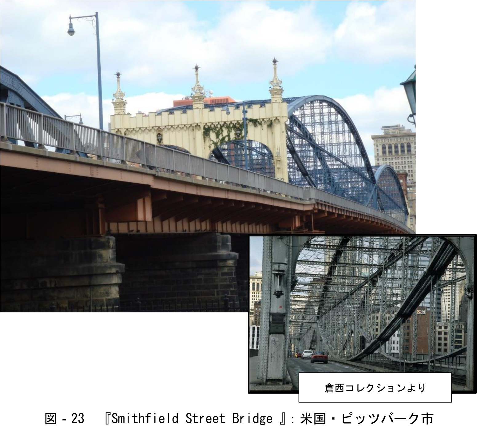 本連載の最後に、偉大な大先輩が亡くなったことを読者の皆さんに報告しなければならない。倉西茂東北大学名誉教授(写真‐3)が今年1月21日(92歳)に天国に召された。倉西先生とは、年回開催される土木学会鋼構造委員会でお会いし、委員会後の懇親会で貴重なお話を聞き、アドバイスを受けるのが恒例であった。倉西先生の出された書籍は『最新 橋構造』など数多くあるが、私が良く見ていたのは倉西先生のコレクションとして公表されていた『アーチを主にした橋の写真集』である。海外に行くたびに、倉西先生のコレクションを見て、その場に行き対比して見て、日本に帰ってくると倉西先生にそのことをお聞きすることが何度かあった。例えば、図‐22に示すヴェネツィアの『嘆きの橋』(石造りアーチ橋)、イギリス・ダブリンのハーペニ橋(鉄製アーチ橋)、そして図‐23に示すペンシルバニア・ピッツバーグのスミスフィールド橋(Lenticular truss bridge)、ニューヨーク州・バッファローのレインボーブリッジ(鋼製固定アーチ橋)などである。今回示した倉西先生コレクション、橋の写真はほんの一部で、私が現地に赴いて撮ったデータと重ねて示している。