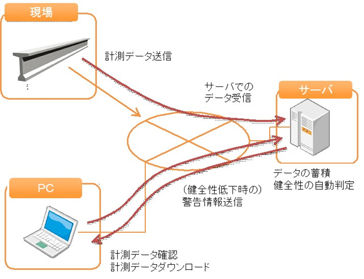 そこで、図-10に示す計測管理システムを構築している。計測管理システムにおいて、計測データは即時、無線通信により別の箇所に構築したサーバに送信され、サーバで、計測データの分析および健全性の評価を自動的に行うものである。また、健全性の低下を検知した場合には、関係者へ速やかに通知するシステムとなっている。また、サーバに格納された計測データは、インターネット回線を通じて、関係者がリアルタイムに確認できるものとなっている。現在までのところ、計測値が管理値を超過したケースは発生しておらず、内ケーブル破断に伴うPC桁の健全性の低下は確認されていない。