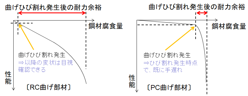 図-6 鋼材の腐食進行に伴うRC構造物とPC構造物の安全性能低下(イメージ)