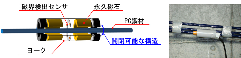 外ケーブル張力の計測には、図-8に示す構造の磁歪式張力センサを用いた。外ケーブル張力の測定方法には、光ファイバーや磁歪式の方法があるが、基礎実験を行い、施工性や工事費、維持管理性、測定精度等の点で優れている磁歪式張力センサに決定した。このセンサは計測対象の強磁性体の応力が増加すると、強磁性体内の磁界が減少するという応力磁気効果を原理としており、永久磁石により一定磁界を発生させ、PC鋼材の応力によって変化する磁界を磁界検出センサにて計測し、張力を算出するものである。このセンサは、列車通過時の動的な張力を計測できる特徴がある。