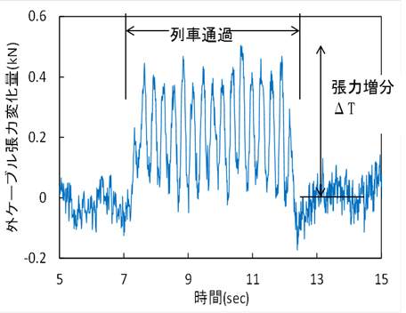 列車通過時の外ケーブル張力の計測結果の一例を図-9に示す。モニタリングにおいては、この波形の振幅、すなわち列車通過時の外ケーブル張力増分を管理指標とし、計測値と管理値とを比較することにより健全性の評価を行うこととしている。また管理値は、ファイバー要素を用いた3次元非線形格子解析を用いて、内ケーブル破断時における外ケーブルの張力増分の予測を行い、曲げひび割れ発生時(当該PC桁の場合は、1主桁あたり6本の内ケーブルのうち5本が破断した時に発生する)の解析値に基づいて設定している。また、モニタリングにより、健全性の低下が確認された場合には、早急にその情報を伝達し適切な対策を講じる必要がある。