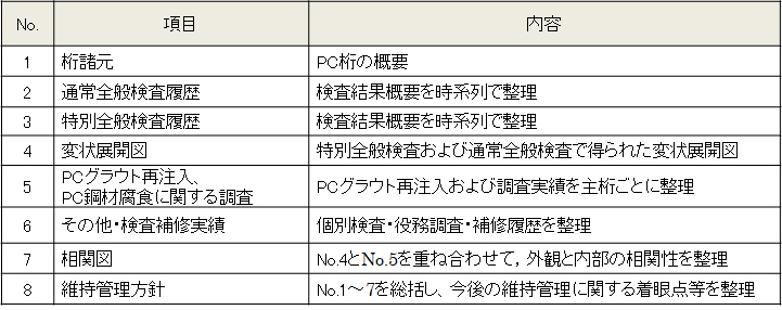 山陽新幹線PC桁の予防維持管理を効率的に実施するためには、PC桁の劣化状態を適切にグレーディングして、優先度の高いPC桁から順次対策を講じる必要がある。しかし、グラウト充填不足に伴うPC鋼材の腐食は外観変状となって現れ難いというPC桁の特徴のため、RC構造物の外観変状に基づくグレーディングをそのまま適用することはできない。このことから、これまでの削孔目視調査によるPC鋼材の腐食状況やその他の詳細調査、補修履歴なども考慮して評価することが重要と考えられる。そのため、PC桁ごとに詳細調査結果や補修履歴を一元管理するPCカルテの整備を進めているところである。PCカルテの構成を表-2に示す。