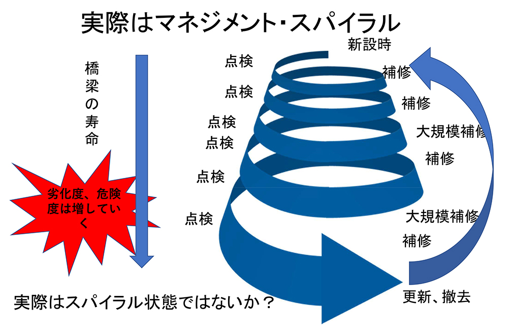 インフラのメンテナンスはサイクルにはならず、負のスパイラルになっていくはずである。一時期言われたのが「再劣化」ということを言ったら、「それは使うな! 現場が混乱する」と注意を受けたが、この「再劣化」の問題を見過ごすと今後の財政に大きく影響をしていく。これに、一部ではやっと気づいてくれたようである。気づかなければ将来につけを回すことになる。